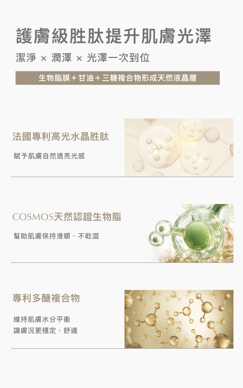 ▸以護膚級胜肽提升肌膚光澤,結合天然生物脂與三重糖保濕